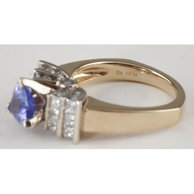 Centering on one trillion cut tanzanite flanked on either side by four vertical rows of 12 princess cut diamonds, the north and south sides of the ring accented with 22 round full cut diamonds; the tanzanite and diamonds weigh approximately 1.01 carats and 1.12 carats respectively, mounted in 14KT yellow gold with matching band. Professional appraisal available.