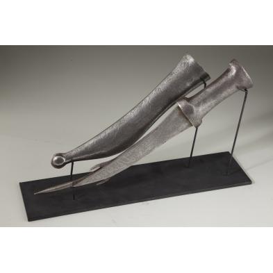 As follows: damscened steel spiked helmet, with fully engraved, gilt-highlighted surfaces, adjustable nasal, plume sockets, chain mail neck guard (22.5 in. with mail), light rusting; engraved damascened steel shield with applied brass outer ring, (4) bosses on face, cloth lining on underside (21.5 in. diameter); overall wear with moderate rusting and fabric deterioration to the back; ceremonial double-headed steel battle axe, blades engraved with avian and floral motifs, some wear with pleasing smooth aged surfaces; multi-pronged dagger with engraved steel blade, hilt and scabbard (17 in. LOA), even, overall wear, cleaned.