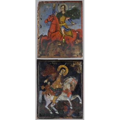 Both painted wooden panels, the first depicts St. Demetrius on horseback (11 x 9 in., moderate worm damage); the second one shows St. George slaying the dragon (11.25 x 9 in., a few small areas of paint loss not affecting the overall appeal of this image).