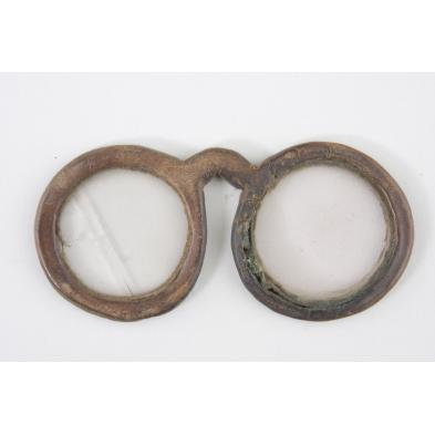 Late 17th - early 18th century, with original lenses and wooden case, the lid being carved with a large "KB" while the underside bears the initials "CBD." These rare spectacles have descended through the family of Christopher "Old Kit" Barbee, a primary benefactor of the University of North Carolina at Chapel Hill. Barbee (abt. 1742 -1832) donated some 225 acres of his Orange County plantation to the original UNC campus in 1792. Much of what is now downtown Chapel Hill, including Franklin and Rosemary Streets, was part of Barbee's bequest.