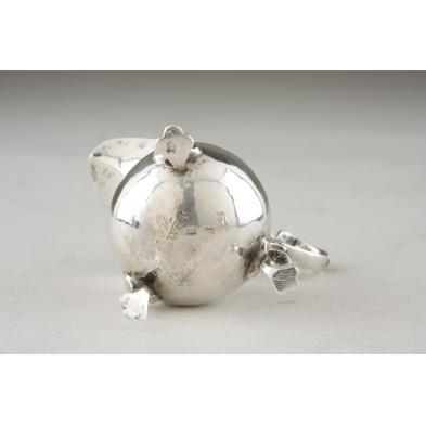 The first of pear form with scalloped rim raised on three cast and applied hoof feet, 1763 London date letter, partially rubbed sponsor's mark, monogrammed "BI*A" on front of belly (4.25 in.; 2.8 troy ozs.); the second also of pear from with scalloped rim raised on three cast and applied trifid feet (one leg reattached to body, another leg with repaired break), partially rubbed hallmarks, monogrammed "MWE" (3.5 in.; 2.5 troy ozs.); and the third an inverted pear form on round foot, the belly with hand-chased floral and shell decoration in the Rococo style with an open cartouche on one side, gadrooned border to shaped rim and foot, elaborate scrolled handle, 1780 date letter and partially rubbed sponsor's mark, light gilt wash to interior (5 in.; 3.5 troy ozs.)