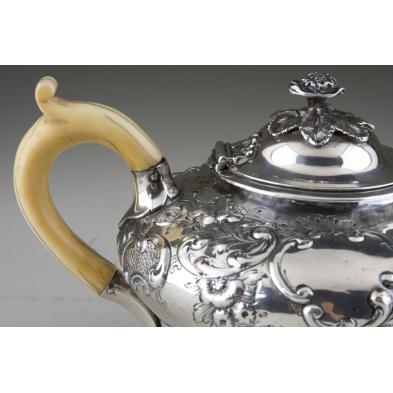 Of compressed globular form raised on four cast and applied foliate scroll feet, the hinged lid with cast and applied rose finial, the body with allover hand-chased floral and scroll decoration, carved ivory handle, fully marked on base with Holland's sponsor's mark and 1859 London date letter and hallmarks.