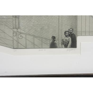 Resist-ground etching and engraving on (2) copper plates with a direct photo transfer of "Julia Passing" (No. 52 in Milton's catalogue) on BFK Rives paper; pencil signed, numbered 4/140, and titled along lower margin; matted and framed under glass; "Passage IV" in number 90 in Milton's catalogue.