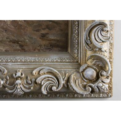 Oil on canvas, signed at lower right "R. Ellison," depicting two young girls in traditional Breton dress washing clothes along the shore while a young boy looks on, housed in the likely original ornate composition frame with D. Zanetti of Liverpool frame maker's label.