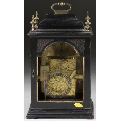 Early 19th century, signed "Lambert London," lacquered wooden case with glass side panels, brass twin fusee movement, engraved steel dial, date aperture at 6 o'clock, subsidiary dial with Strike and Silent settings, applied pierced brass spandrels to face, brass finials and handle.