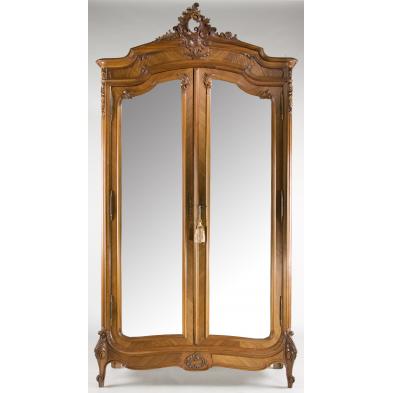 Early 20th century, mahogany and angular book matched mahogany veneers, the armoire with a highly carved asymmetrical foliate cartouche over (2) doors each with beveled mirrors, (the glass surrounded by shaped moldings) that open to a fitted interior of maple and tiger maple with adjustable shelves and (3) drawers, raised on carved cabriole whorl feet. The conforming bed has (2) sets of rails, the originals as well as later ones of a longer length. Armoire : 101 x 53.5 Bed: Outside measurement 87" x 67.5" Inside measurement 82" x 57" Height of Bed Rail 13" Height Overall 66.5"