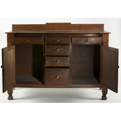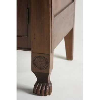 Orange County, circa 1830-40, walnut with poplar and yellow pine secondary woods, three side-by-side cock beaded drawers over medial column of drawers, the bottom one a bottle drawer, flanked on each side by a single hinged paneled door, raised on (what appears to be original) applied front paw feet surmounted by a carved sunburst.