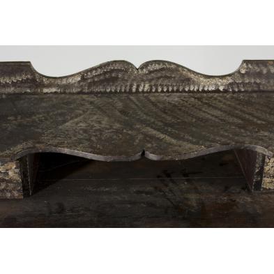 Chatham County, 19th century, yellow pine and poplar, two small upper drawers divided by an open shelf surmounted by a scalloped shelf and shaped backsplash, the case having four graduated lipped drawers, chip carving to sides and case front corners, raised on deeply scalloped feet. The chest is painted a russet color with all over white sponge decoration.