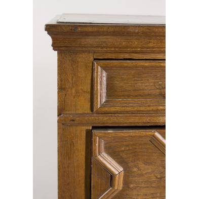 Circa 1700, English, walnut with oak secondary, (3) drawer form with applied moldings, drawers with side dado joinery/runners.