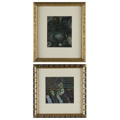The first an oil on paper, signed at lower left "Ackerman," still life of a seltzer bottle and glass on a tabletop, matted and framed under glass (SS 8.75 x 9.5 in; DOA 17.75 x 17.75 in); the second also an oil on paper, signed at lower left "Ackerman," still life of a potted plant, matted and framed under glass (SS 8.75 x 7 in; DOA 16.75 x 14.75 in).
