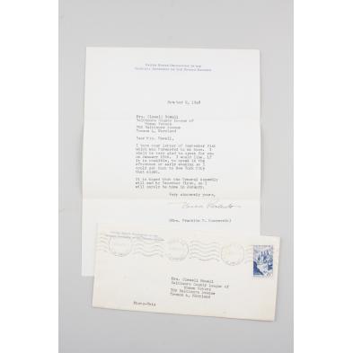 Highlighted by (3) Typed Letters Signed "Eleanor Roosevelt," variously written from France and Hyde Park, to Mrs. Clewell Howell, Baltimore County, Maryland League of Women Voters, November, 1948 through January, 1949. This correspondence regards a talk Mrs. Roosevelt was to give before the group. Also included are many associated letters, news clippings and photographs.