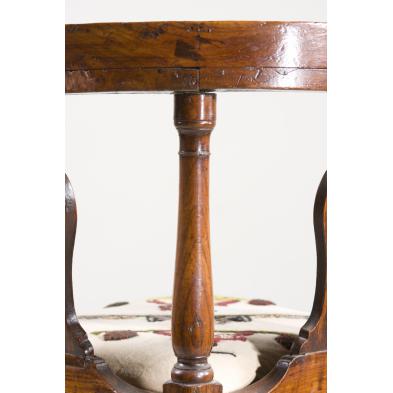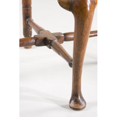 Elm wood, round about form, double vasiform splats, slip seat with crewel worked fox hunt scene on cream field, front cabriole leg with "X" stretcher base.