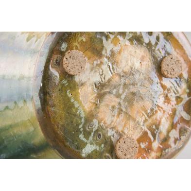 Earthenware, bulbous and footed vase with attractive multi-colored glaze; possibly Jonah Owen.