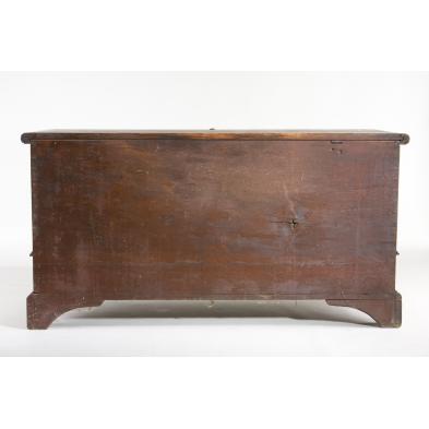 18th century, poplar and Southern yellow pine with old red painted surface. The lid, with bread board ends, is attached to the dove-tailed case by means of hand forged rat-tail hinges. The chest has two side-by-side lower drawers, an interior till with two secret compartments, the case raised on an applied bracket foot base. Of special interest is the steel crab lock and the brass plate around the keyhole, which is inscribed "Peter Schutz / York / JN 133."