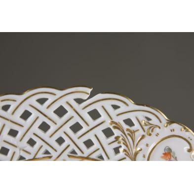 (10) plates with reticulated border and hand-painted floral and gilt decoration (8 in.), one with rim damage and repair, (2) plates with hand- painted floral and gilt decoration surrounding a central motif in mulberry with two putti in repose and at play (8.5 in.).
