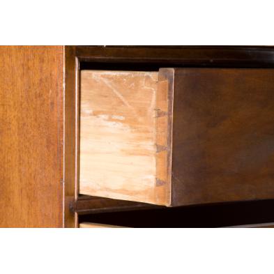 Massachusetts, old warm surface, birch with white pine secondary, divided interior with letter slots and short drawers over four graduated long drawers, the skirt with carved shell pendant, raised on applied ogee bracket feet.