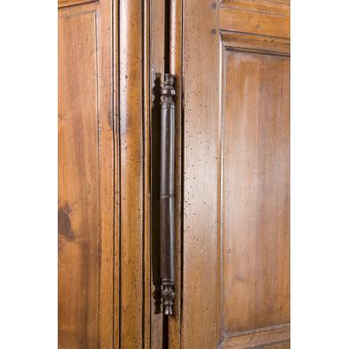 Having a removable double cove molded cornice over a paneled frieze, triple paneled hinged doors mounted with original iron hinges open to a shelved interior, the case sides also triple paneled, supported on bun feet.