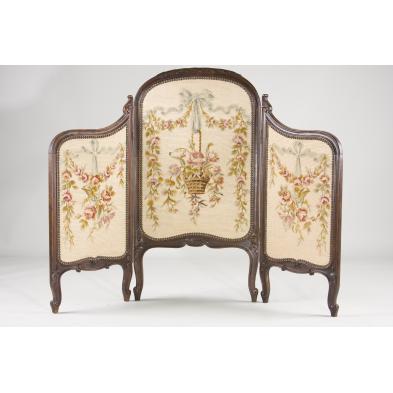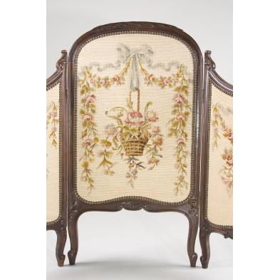 Early 20th c., a walnut frame surrounds the attractive floral swag and ribbon needlework panels, the frame being arched and curved, the central section with carved foliate crest rail flanked by side panels with applied volutes, the whole raised on six delicate cabriole legs terminating in whorl feet.