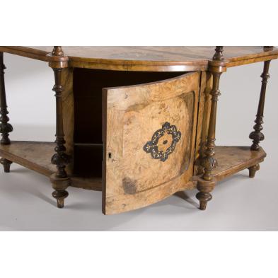 Burled wood veneer with light and dark wood inlays, applied fretwork crest and corner decoration, central beveled mirror flanked by raised display shelves over and open shelf over a shelf having a central convex door, all with turned and carved supports.