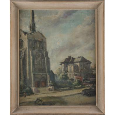 Oil on board, signed and dated at lower right "J. Batchelor 1945," inscribed on the verso "26th and Broadway / (The Carriage (illegible)) / Jonathan (illegible) 1945," housed in the original frame.