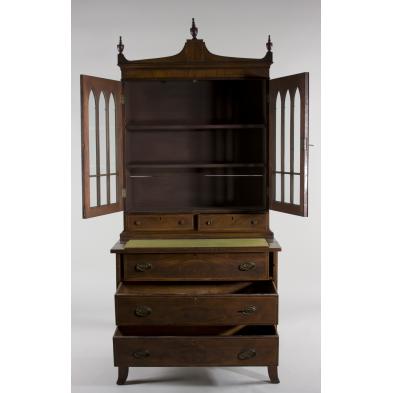 Mid-19th c., two part form, mahogany and mahogany veneers, white pine secondary, the bookcase having a pediment decorated with finials over gothic arched glass doors over two side by side drawers each with line and checkerboard inlays; the bureau section with a fold out writing surface over three drawers all with inlay raised on shaped bracket feet.