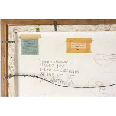 Oil on masonite, signed and dated at upper left "Joesph / 57", titled on the verso "Still Life with Blue Vase," inscribed on the verso "Joseph Perrin / Atlanta Division / Univ. of Georgia / 24 Ivy Street S.E. / Atlanta, GA," retains paper exhibition label for the 153rd Annual Exhibition of American Oil Painting and Sculpture at the Pennsylvania Academy of Fine Arts and the Detroit Institute of Arts, collection label indicating 1957 purchase. Perrin was the head of the Georgia State College Art Department in the 1960s. In addition to the Mead Collection, his paintings are in the High Museum in Atlanta and the Coca Cola Collection.