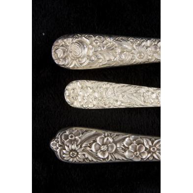 (53) pieces including: (8) knives (9", assorted blade types), (8) forks (7.25"), (8) salad forks, (7) iced tea spoons, (12) teaspoons (6", three with monogram), (2) teaspoons by Stieff (6"), (2) 5 o'clock spoons (5.5"), one with monogram, (2) demitasse spoons, (1) salt spoon, (1) master butter knife, (2) pc. carving set.