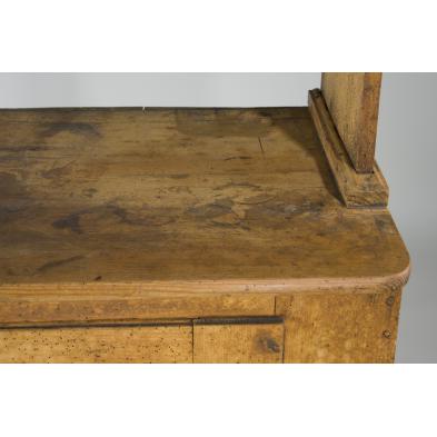 Retaining some mustard paint, two-part form, the upper part with three open shelves, the dovetailed base with two raised paneled doors, shoe feet, doors with original hardware.