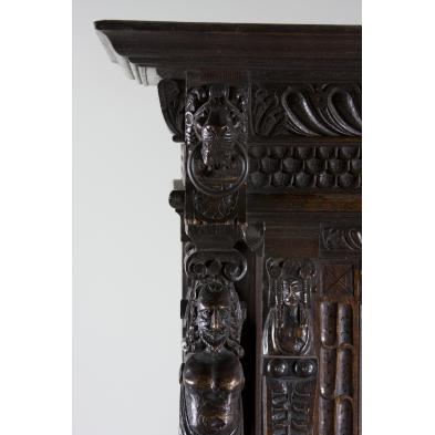 Late 19th / early 20th c., two-part form, the upper with two set back doors having figural supports, the lower having a full width drawer over two doors each with a lion head pull, the doors flanked by classical head in high relief, shaped platform base.