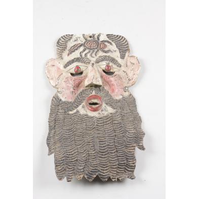 Suffering Moor, 10" high, and Day of the Dead, 15" high, both polychrome carved wood; the third Los Barbones, polychrome copper plate, 20" high. Old museum collection numbers penned on the back of each mask.