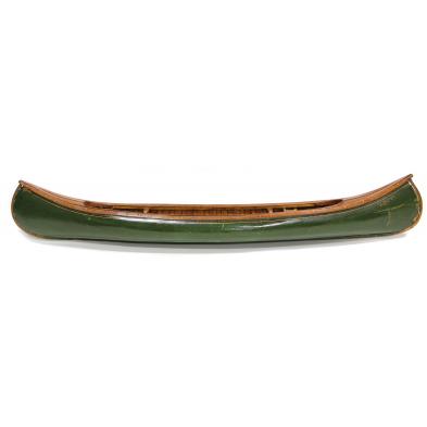 Circa 1900, wood and canvas, likely a Kennebec salesman's sample, mahogany and pine frame with brass tacks, green painted hull with gold striping and decals naming the craft "Lucy,'' interior with fore and aft deck, closed guwhales, two seats and two thwarts.