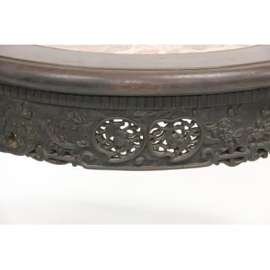 19th century, hardwood, the shaped oval top inset with rouge marble, featuring an ornate foliate and floral carved apron and cabriole legs joined by cross stretchers carved with full bodied forms of rodents.