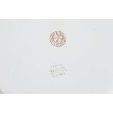 To include a vase with garden landscape featuring birch trees and hollyhocks, with mark 1912-1918 (8.25 in.); poppy decorated bowl (2.25 x 9 7/8 in.) and plate (8.75 in. diameter); and tulip bowl with mark 1898-1903 (2.25 x 9 7/8 in.); all artist signed.