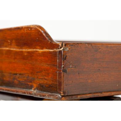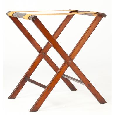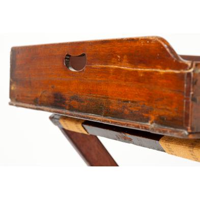 Early 19th century, mahogany tray with handle grips, supported by a later, probably early 20th century, collapsible mahogany "X" shaped stand with burlap straps for support of the tray.