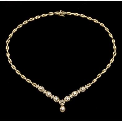 Of fancy oval links suspending central station consisting of (6) oval links each set with one round brilliant cut diamond (approximately 1.62 total carats, S color, SI1-SI2 clarity) and framed with full cut diamonds (approximately 2.12 total carat weight, M-N color, SI3-I1 clarity) and a drop diamond pendant (approximately .58 carat, S color, SI1 clarity), approximate total diamond weight of the necklace 4.32 carats, the yellow gold mounting stamped 14KT.