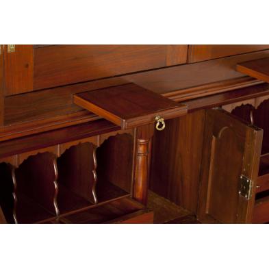 Rocky Mount, NC, 20th century, mahogany, with pine secondary, bold cornice with dentil molding, two raised panel doors open to reveal shelved interior, appropriate antique style brass hardware, pullout candle shelves, fall front opens to reveal pigeon holes, drawers and door with document drawers, lower case beneath fall front features one over two over two drawers, raised on bracket feet, corner columns to both upper and lower case pieces, with label.