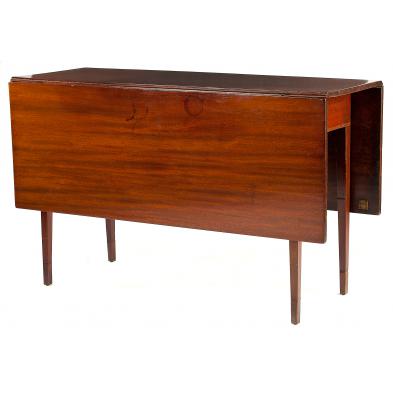 Circa 1800, three part form, mahogany with mahogany veneers, white pine secondary wood, central drop leaf gate-leg table with two D ends, veneered skirt with inlayed edge, line inlayed tapered leg with cuffs.