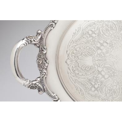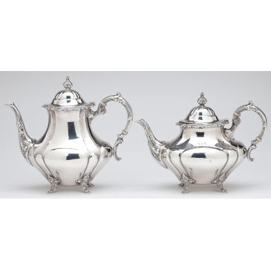 In the "Georgian Rose" pattern; (4) piece set including a coffeepot (9.5 in.), teapot, creamer, and lidded sugar bowl; all presented atop a complementary Reed & Barton "Tara Hall" silverplate double handled waiter.