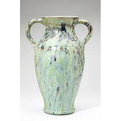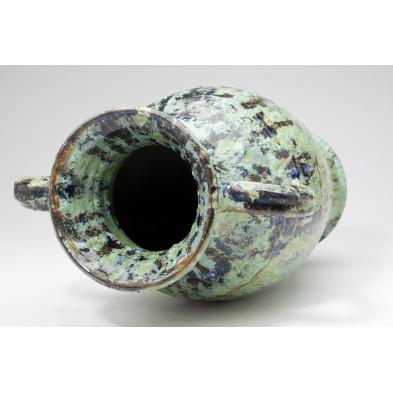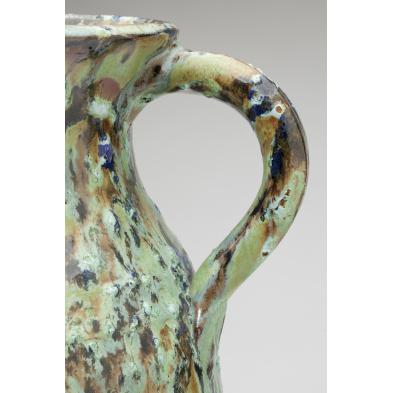 Trophy form with thickly applied multi-colored glaze, the glaze exhibiting numerous craters, one vase with the potter's stamp.