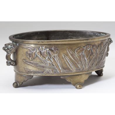Oval form with archaistic applied mask form handles, the sides with iris design in relief, raised on four cast and applied feet, unmarked.