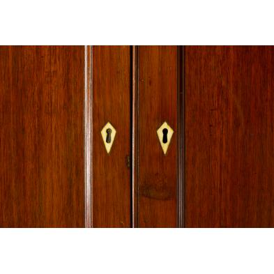 Two part form, early 19th century, mahogany, mahogany veneer, pine secondary, the upper section with stepped cornice over blind doors, interior shelves. The lower section with inlaid slant lid concealing interior drawers above four graduated cock-beaded drawers, bracket foot base.