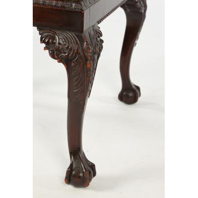 Late 19th century, English, mahogany, with high crest centered between acanthus carved ears, intricately carved and pierced back splat, slip seat with antique needlepoint upholstery enclosed within a seat rail bas relief carved with acanthus leaves on three sides, cabriole legs, ball and claw feet.