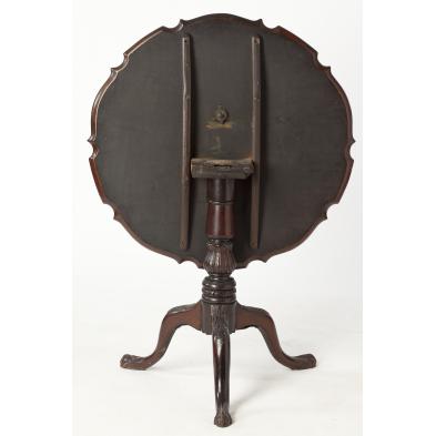 18th century, tilt top form, having a one board top with shaped and molded pie-crust edge, an acanthus carved standard, cabriole legs with relief carved knees and slender ball and claw feet.