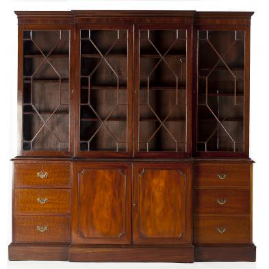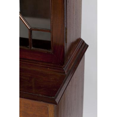 Mahogany and mahogany veneers, six part form, applied molded cornice, veneered frieze, upper glass doors with nicely molded mullions, base with divided door and drawer configuration.