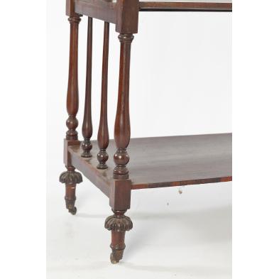 Rosewood veneer, two upper side by side drawers above two lower shelves, turned supports and spindle sides, acanthus carved feet on brass casters.