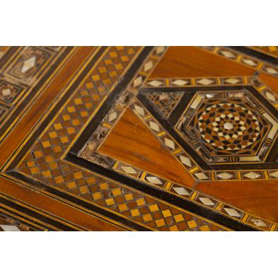 Circa 1900, exotic mixed light and dark wood veneer and inlays including mother-of-pearl, swivel hinged top, interior game surface opens to reveal backgammon board below, cabriole legs, stretcher base, ornamented on all four sides, inscribed on the interior storage compartment "(illegible) Buffalo/NY."