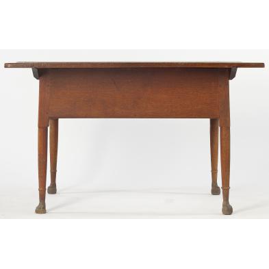 Circa 1800, walnut, poplar secondary, two board pin top, single lipped drawer, turned legs with raised pad foot, molded edge to lower skirt.