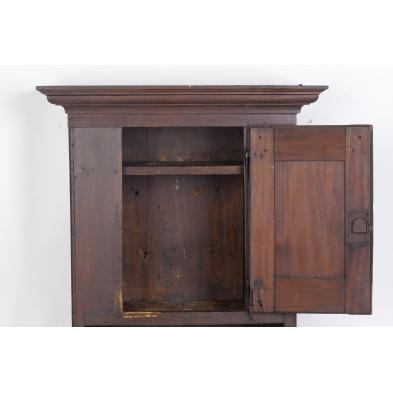 Circa 1800, probably Pennsylvania, poplar, applied molded cornice, single raised panel door with rat tail hinges, molded cornice and scrolled sides.