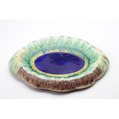 Both with rich cobalt predominant, the first a bowl with scalloped border and fern design to the interior (3 x 9.25 in.); the second is a bread tray with wheat motif below basket-weave edging (13.5 x 11 in.).