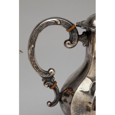 (4) piece set including coffeepot (9.5 in.), teapot, cream jug, and lidded sugar bowl. Each marked "Handarbeit Sterling Ferner," with paneled sides, Bakelite insulators to handles, and Heidelberg Rose finials. Presented atop a matching double handled silverplate waiter with custom fitted glass liner (27.5 x 17 in.).